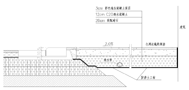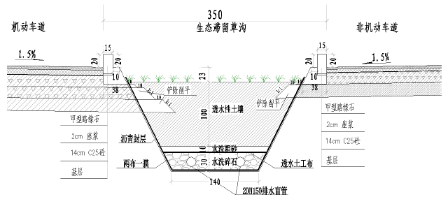 利用道路側向分隔帶設置3.5m寬生態(tài)滯留草溝,并設置人行道透水鋪裝,道路橫坡坡向側分帶內的生態(tài)滯留草溝,考慮開口路牙或者平路牙的入流形式。