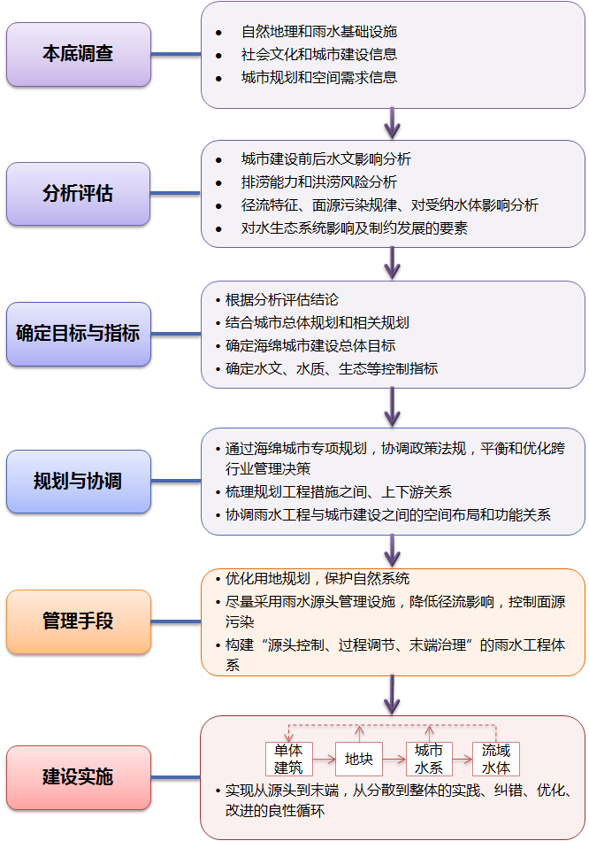 連云港海綿城市建設(shè)的技術(shù)路線首先需要調(diào)查城市的本底情況,掌握支撐城市建設(shè)管理的基礎(chǔ)信息;其次在本底調(diào)研、分析評估的基礎(chǔ)上,確定海綿城市建設(shè)的目標(biāo)與指標(biāo);再次通過規(guī)劃協(xié)調(diào)、建設(shè)實施,由點到面、系統(tǒng)推進(jìn)海綿城市的建設(shè)。