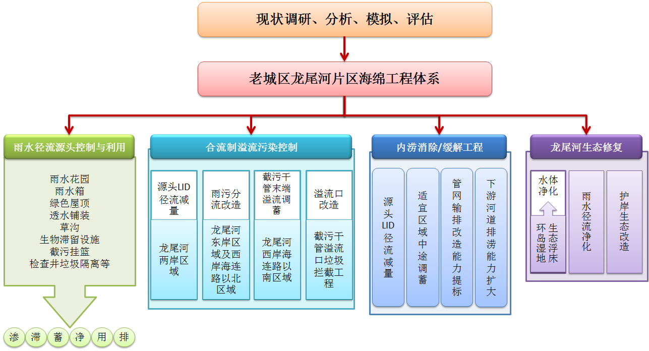 結(jié)合試點區(qū)域的水文、地質(zhì)、水資源、建筑密度、綠地率、土地利用布局、匯水區(qū)特征和LID 設(shè)施的功能、經(jīng)濟(jì)性、適用性、景觀效果等因素,具體提出”滲、滯、蓄、凈、用、排“等工程總體布局,包括四大工程體系(水生態(tài)修復(fù)、內(nèi)澇風(fēng)險防治、合流制溢流污染控制、雨水徑流源頭LID工程)。