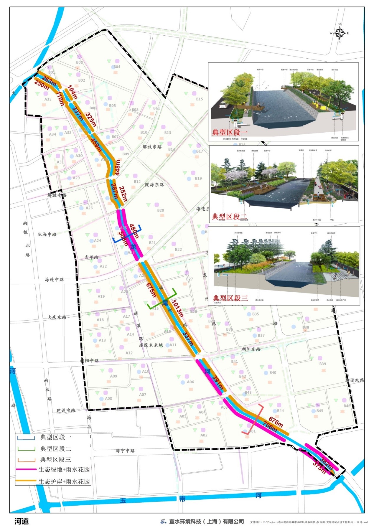 對龍尾河兩岸的綠化帶進(jìn)行改造,將綠帶寬度大于10m的進(jìn)行駁岸和綠化帶改造,處理河岸兩側(cè)雨水徑流,為超標(biāo)雨洪提供入河行泄路徑,在局部區(qū)域打開駁岸生態(tài)處理,改善水生態(tài)環(huán)境,提高景觀價值,改造長度約5.94km,面積59400m2;對綠帶寬度小于10m的,保留原有河岸,改造綠化帶,增加生物滯留帶,凈化周邊道路雨水徑流,改善區(qū)域生態(tài)微環(huán)境,建設(shè)長度約2.84km,面積14200m2。