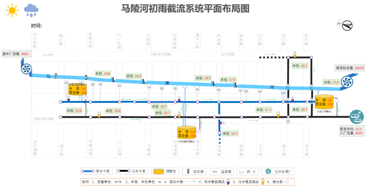 項(xiàng)目成果:作為馬陵河智慧系統(tǒng)的一部分,對接本地水質(zhì)水文氣象監(jiān)測信息,定制化開發(fā)馬陵河初雨截流實(shí)時(shí)模擬系統(tǒng),實(shí)現(xiàn)馬陵河截污系統(tǒng)與污水廠聯(lián)動(dòng)運(yùn)行調(diào)度方案評估,制定馬陵河截流系統(tǒng)運(yùn)行調(diào)度方案,并結(jié)合降雨預(yù)報(bào)和水位監(jiān)測,實(shí)現(xiàn)調(diào)蓄池和泵站運(yùn)行調(diào)度方案下的溢流風(fēng)險(xiǎn)預(yù)報(bào)預(yù)警,為溢流污染控制提供輔助工具。