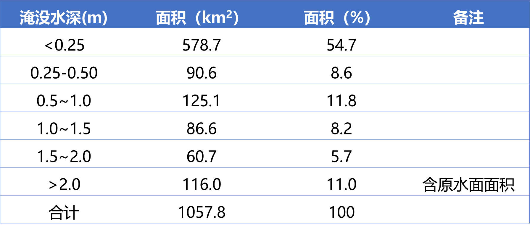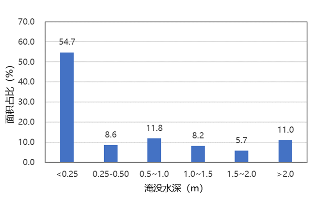 進(jìn)一步統(tǒng)計(jì)淹沒(méi)水深面積占比,最大積水深度超過(guò) 0.25m的面積為 479.1 km2,占總面積的 45.3%,其中,0.5~2m的面積為272.4 km2,占比25.8%;2m以上的面積達(dá)到116.0 km2。