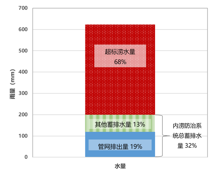 根據(jù)上述特征暴雨雨量分析,管網(wǎng)在設(shè)計(jì)能力條件下排水量(含海綿設(shè)施)占本次極端降雨總雨量的19%,50年一遇防澇系統(tǒng)排水量(含管網(wǎng))約占32%,超標(biāo)雨水占比達(dá)到68%,大量超出內(nèi)澇防治體系能力標(biāo)準(zhǔn)的雨水將形成快速的地表坡面匯流,流向地勢(shì)低洼區(qū)域。