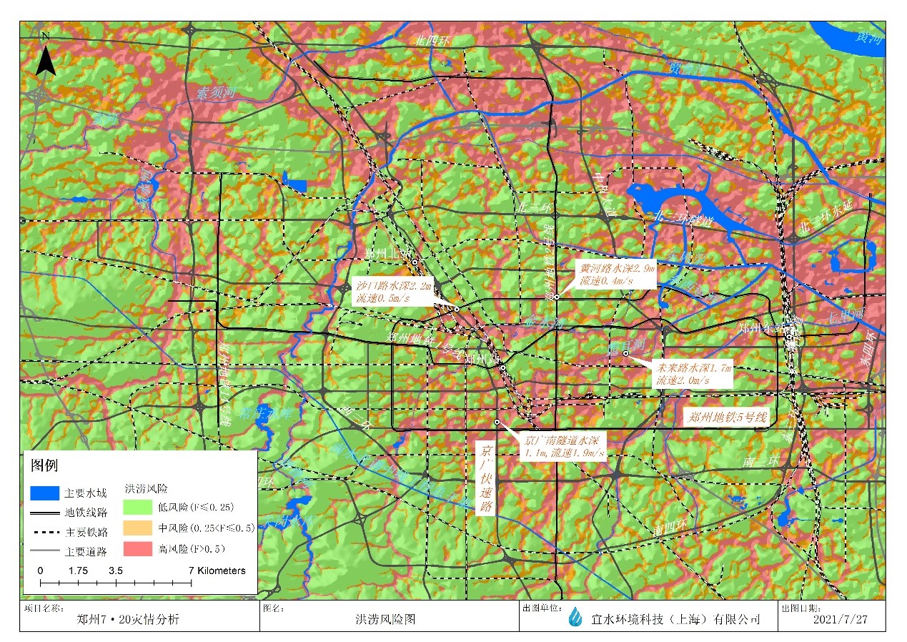 此外,賈魯河、金水河、十八里河和七里河等河道中上游兩岸也存在中、高淹沒(méi)風(fēng)險(xiǎn)區(qū),此次鄭州暴雨導(dǎo)致城區(qū)內(nèi)河道遠(yuǎn)超其排水能力。大部分區(qū)域淹沒(méi)水深大于0.5米,甚至1-2米,流速大于0.8米/秒,水流風(fēng)險(xiǎn)極大,嚴(yán)重影響城市安全。
