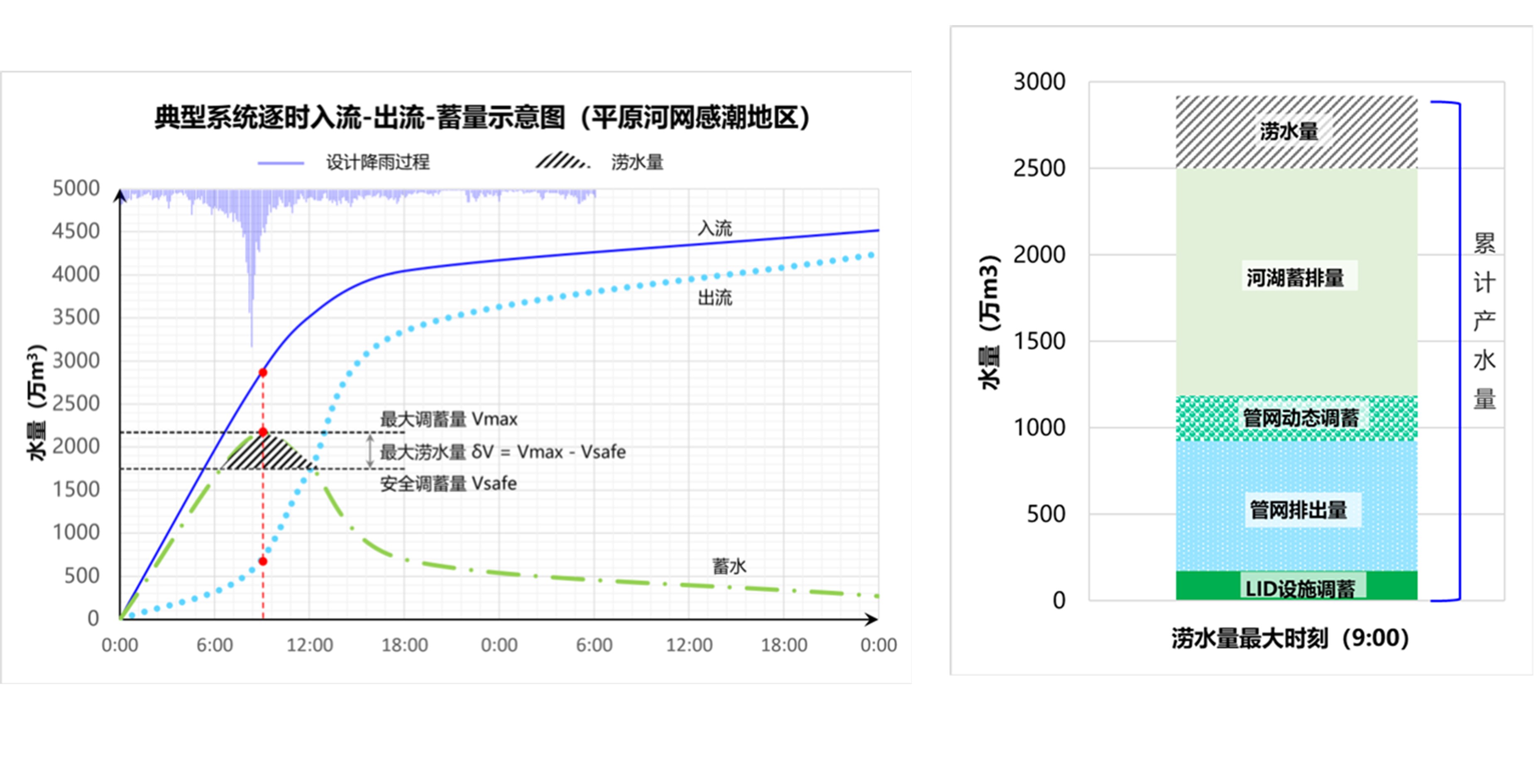 任一排水系統(tǒng)(或子系統(tǒng)),降雨徑流進(jìn)入系統(tǒng)后,是排水能力與系統(tǒng)調(diào)蓄量之間的平衡。當(dāng)排水能力受限,系統(tǒng)調(diào)蓄量超過(guò)防洪排澇設(shè)計(jì)標(biāo)準(zhǔn)安全蓄量時(shí),發(fā)生內(nèi)澇(見(jiàn)圖11)。