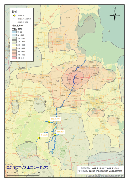 宜水環(huán)境科技根據(jù)從GPM獲取實(shí)測(cè)雨量,繪制了3日雨量等值線圖(8月17日8:00至21日8:00),以及最大24小時(shí)(19日8:00至20日8:00)雨量等值線圖(請(qǐng)見(jiàn)圖10 和圖11)。從諸多新聞獲取的事件描述回顧,GPM獲取的雨量在總量、時(shí)程分布特征和空間特征方面極為相似,因此在缺乏官方實(shí)測(cè)雨量資料的前提下,GPM雨量極具可替代的研究?jī)r(jià)值。