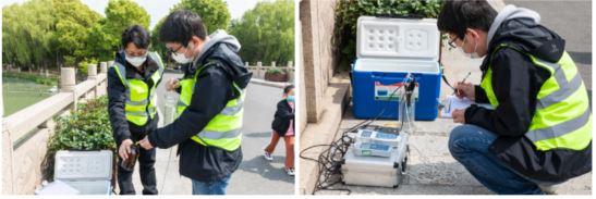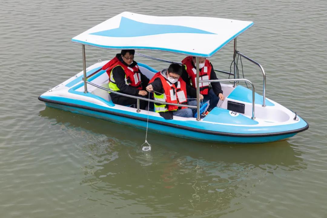 ▲工作人員對(duì)森林公園水質(zhì)進(jìn)行采樣監(jiān)測(cè)