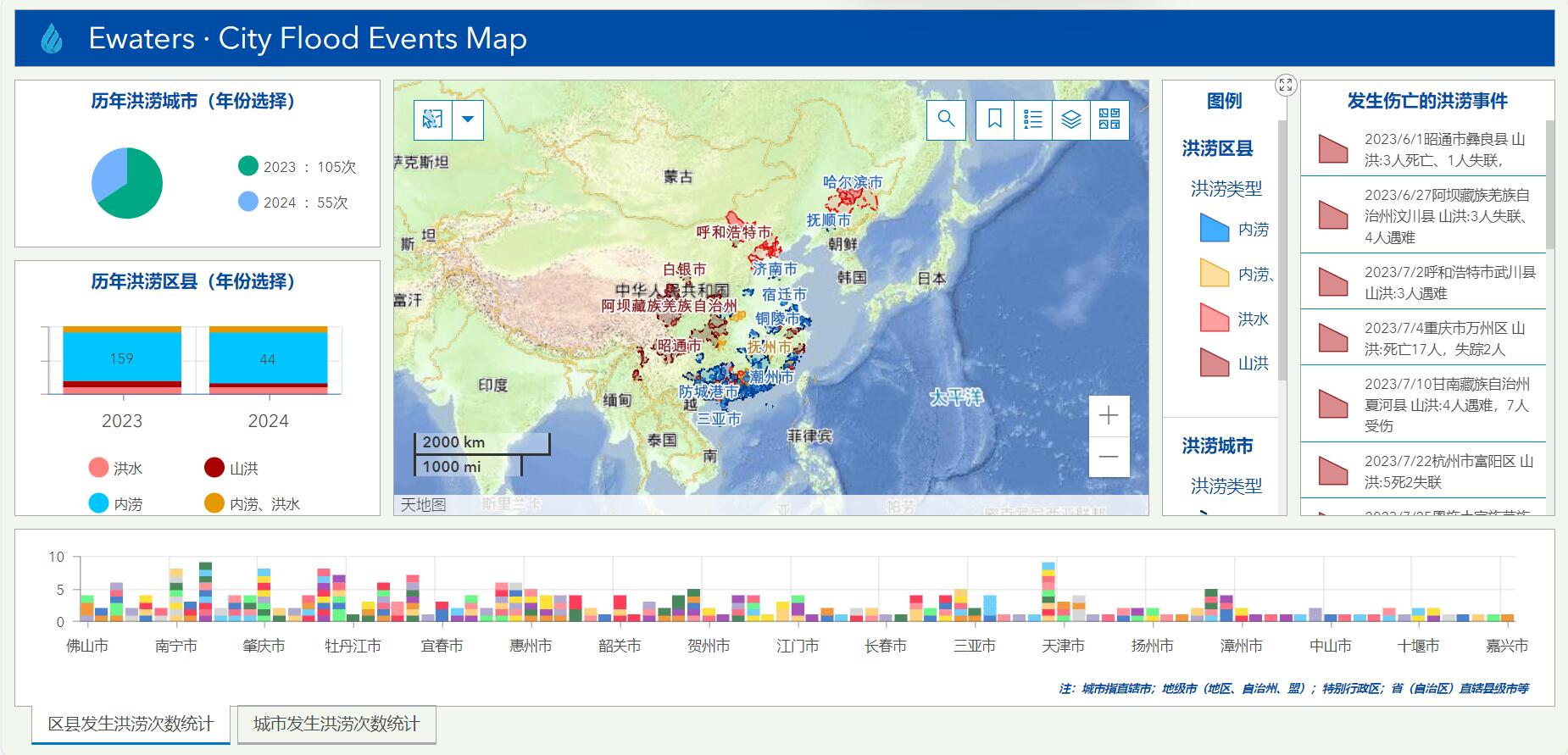 從2023年起,宜水環(huán)境開始每日收集和整理最新官網(wǎng)網(wǎng)站和官方媒體報(bào)道的洪澇事件,并編制了城市洪澇事件地圖,我們對(duì)近年發(fā)生的洪澇事件進(jìn)行了分類和統(tǒng)計(jì),分析洪澇災(zāi)害特征,并通過專業(yè)的可視化展示,期望提升公眾對(duì)洪澇災(zāi)害的認(rèn)知。